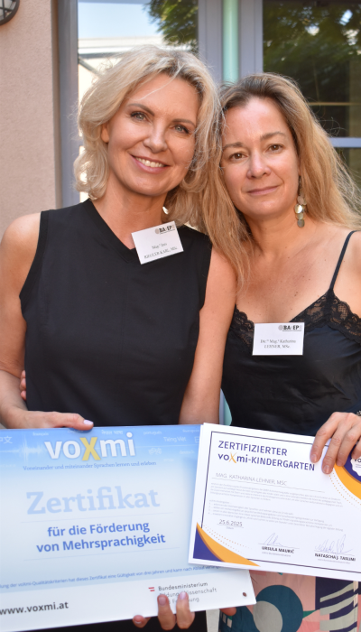 Der Praxiskindergarten der BAfEP 8 wurde am 25. Juni 2025 als erster Kindergarten voXmi-zertifiziert. Dafür wurden in einem ersten Schritt mit Hilfe der voXmi-Checkliste Schwerpunkte für die Entwicklung zu den voXmi-Prinzipien bestimmt. Um Einblick in die konkrete voXmi-Arbeit zu geben, hat das pädagogische Team auf einem Padlet jene Aktivitäten und Bildungsangebote beschrieben, die der Kindergarten aufbauend auf die Theorie der 5 Bausteine für eine umfassende sprachliche Bildung, die für voXmi das Fundament bilden, setzt.