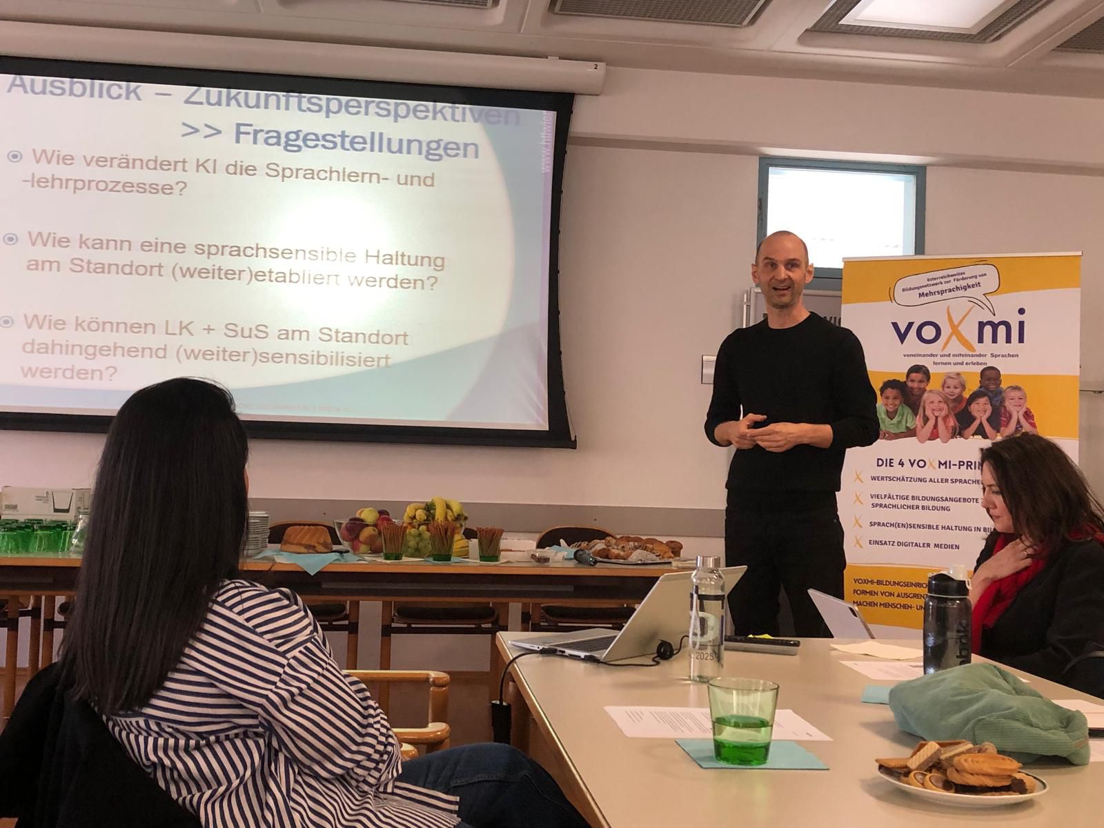 Für die Zukunft haben wir uns klare Ziele gesetzt und möchten das voXmi-Netzwerk aktiv als Plattform für Austausch und Weiterentwicklung nutzen. Wir wollen von Best-Practice-Beispielen anderer Schulen lernen und gleichzeitig unsere eigenen Erfahrungen einbringen. Besonders beschäftigen uns dabei Fragen nach der Rolle von künstlicher Intelligenz in Sprachlernprozessen und der weiteren Etablierung einer sprachsensiblen Haltung am Standort. Zudem prüfen wir das Potenzial, unsere fachlichen Ressourcen zu nutzen, um künftig noch weitere Sprachen als Wahlfächer anzubieten. Wir sind stolz darauf, diesen Weg als voXmi-Schule gemeinsam zu gehen und die sprachliche Identität unserer Schulgemeinschaft weiter zu stärken.