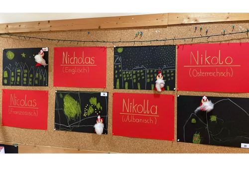 Im Kindergarten stand der Nikolaustag heuer ganz im Zeichen der Sprachenvielfalt. Die Kinder gestalteten liebevoll ihre Nikolauszeichnungen und" NIKOLAUS" wurde in den Familienprachen der Kinder dazugeschrieben.